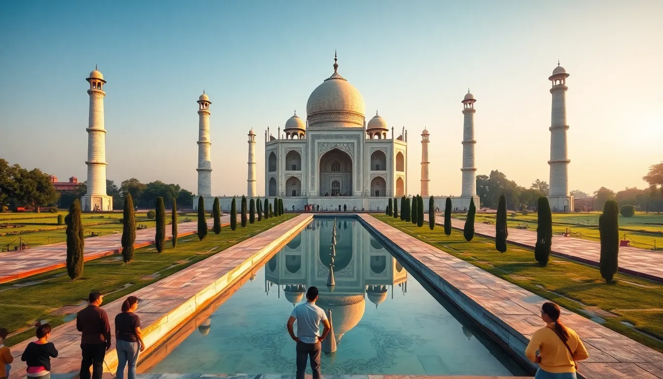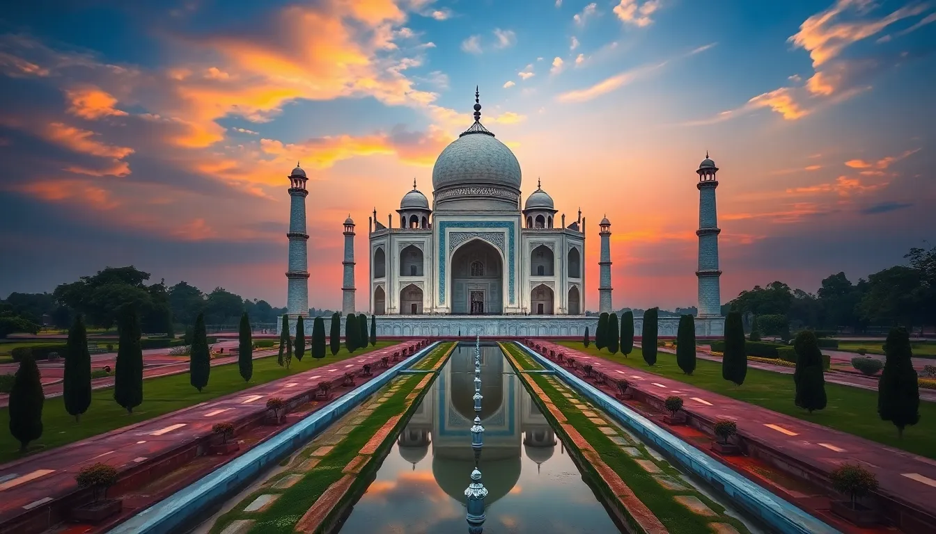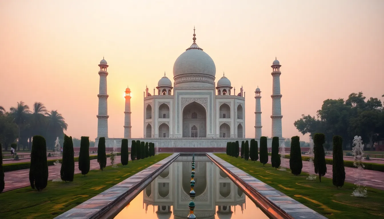 The Taj Mahal, located in Agra, India, stands as a symbol of undying love. Built in the 17th century by Emperor Shah Jahan, this mausoleum showcases stunning white marble adorned with intricate inlays of precious stones. Tourists flock to see its majestic dome and serene reflecting pool, especially during sunrise and sunset when the marble glows. UNESCO designated the Taj Mahal as a World Heritage Site in 1983, highlighting its cultural and historical importance. Its gardens, featuring well-maintained pathways and fountains, provide a tranquil atmosphere, ensuring visitors experience a sense of peace amid its grandeur.